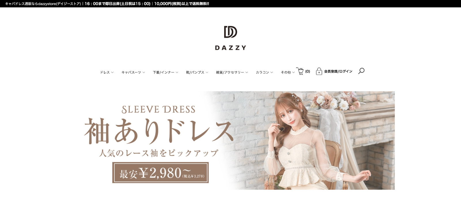 「DAZZY(デイジー)」は、キャバドレスや風俗衣装に特化した通販サイトです。ミニドレスからロングドレス、セクシーランジェリーまで幅広く取り扱っており、価格も比較的リーズナブル。